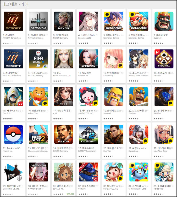 ▲ 2017년 7월 31일 오전 국내 구글플레이 게임부문 최고매출 순위 갈무리