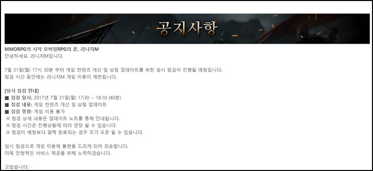 엔씨소프트(대표 김택진)는 자사의 모바일 MMORPG(다중접속 역할수행게임) '리니지M'에서 31일 17시 30분부터 18시 10분까지 약 40분간 임시 점검을 진행한다고 밝혔다.
