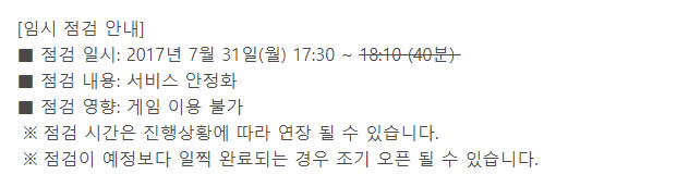 * 2017년 7월 31일 18시 17분 게임내 튕김 현상 발생. 클라이언트에서 점검 표기