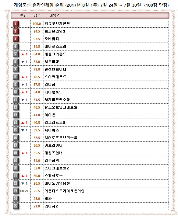 하위권에선 여름방학을 기점으로 순위를 올린 ‘테일즈런너’가 1계단 더 상승해 18위를 기록했으며 ‘카운터스트라이크온라인’이 순위권에 등장했다.