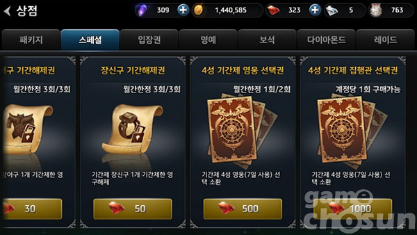 처음 루비를 모은 이후에는 최초 4성 집행관, 4성 영웅권 구매가 필연적이지만, 이후에는 여러 상품속에서 고민을 하게 된다. 이 때 선택할 수 있는 효율좋은 상품은 대부분 '스페셜 상점'에 모여있다.