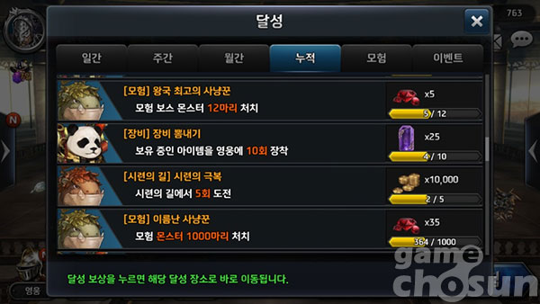 업적 중에서는 '이름난 사냥꾼'과 '왕국 최고의 사냥꾼' 업적이 루비를 제공한다. 업적 단계에 따라 루비를 차등지급하는 만큼 모험을 꾸준히 돌리는 것이 중요하다.