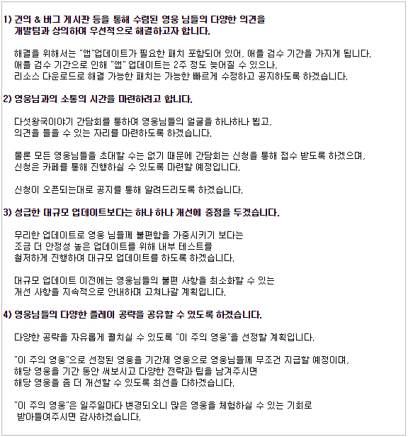 먼저 이용자 건의와 버그 제보 반영을 최우선 과제로 삼아 패치를 진행한다. 업데이트 불편사항 개선에 주력할 예정이며 무대형 업데이트로 콘텐츠 양만을 늘리기 보단 내부 테스트를 철저히 진행한 후 적용하는 방향으로 내실을 다진다.