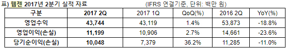 웹젠(대표 김태영)이 2017년 2분기 실적을 공시했다.