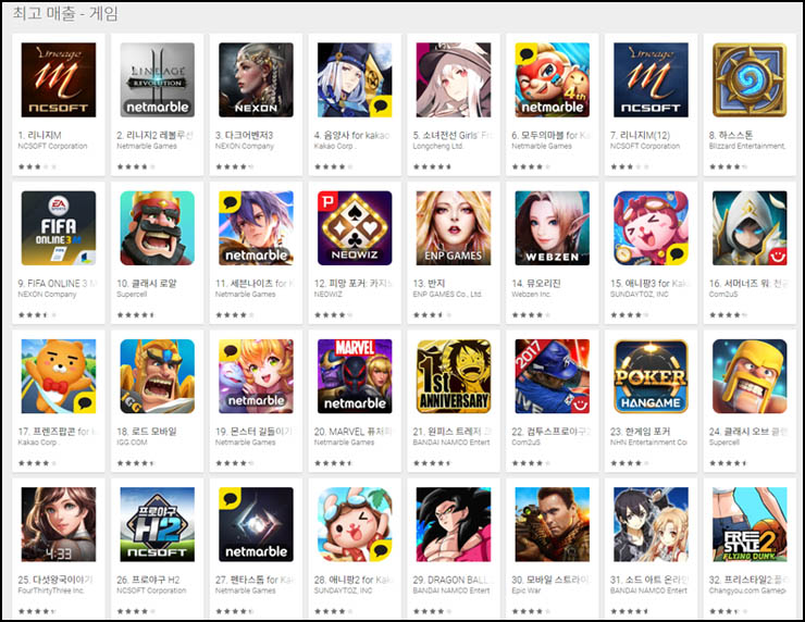 △ 2017년 8월 14일 오전 구글플레이 게임 부문 최고 매출 순위 갈무리