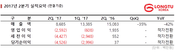 룽투코리아(대표 양성휘)는 2017년 2분기 결산 결과 매출 86억8500만원, 영업손실 25억9200만원 당기순손실 45억2600만원을 기록했다고 14일 공시했다.