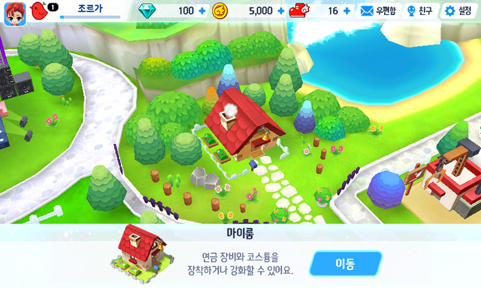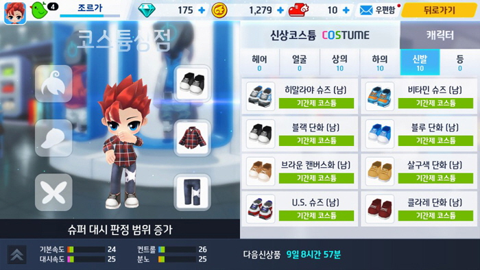 게임내 재화는 다이아 뿐만 아니라 게임을 진행하기 위해 필요한 '신발'이라는 아이템도 존재한다. 일정 시간마다 신발을 생산하는 '친환경 신발 제조기'나 아이템을 생산하는 '연금 솥단지', 추가 계정 경험치를 올려주는 '체리 아이스크림 상점' 등 각각의 효과를 가진 건물들이 존재한다. 무조건 달리기만 하는 것이 아니라, 유저에게 주어진 한정된 부지에 전략적인 건물 건설도 필요하다.
