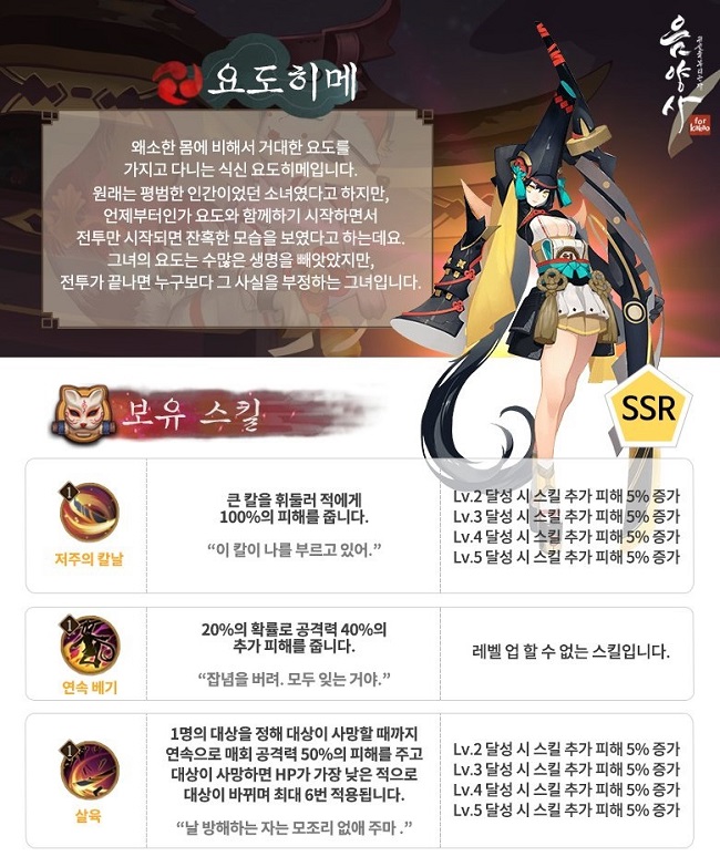 이번에 추가되는 SSR 등급 식신 '요도히메'는 딜러의 포지션을 가지고 있다. 필살기라 할 수 있는 '살육'의 경우 1명의 대상을 6연속 공격하고 만약 해당 대상이 사망할 경우 HP가 가장 적은 대상 1명을 이어서 공격한다. 따라서 대미지가 낭비되는 일이 없는 스마트형 딜러다. 또, 패시브 기술인 '연속 베기'는 일정 확률로 추가 피해를 줌으로써 '살육' 기술 한 번으로 1턴에 두 명의 적도 쓰러트리는 것이 가능하다.