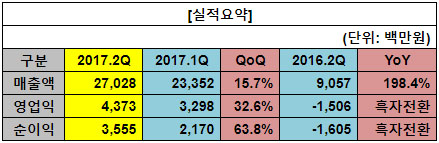 2017년 2분기 매출액 270억2800만원으로, 2017년 1분기 대비 15.7%, 2016년 2분기 대비 198.4% 증가했으며, 2017년 2분기 영업이익 43억7300만원으로 2017년 1분기 32.6% 증가 및 2016년 2분기 영업손실에 비해 큰 폭으로 개선됐다.