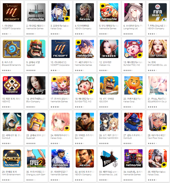 ▲ 2017년 8월 21일 오전 구글플레이 게임 부문 최고 매출 순위 갈무리