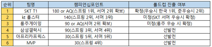 삼성갤럭시와 아프리카프릭스, MVP는 각각 챔피언십포인트 90, 30(서머 성적 우선시), 30점으로 각각 선발전 2, 3, 4위로 롤드컵을 향한 도전을 진행한다.