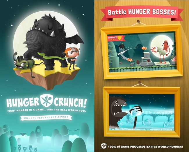 비영리단체 'Rice Bowls'에서 개발한 '헝거크런치'는 모바일 횡스크롤 런게임 장르로, 전세계에서 고통받고 있는 기아를 위해 개발된 사회 공헌 게임이다. 'Facebook's 2015 Social Good App of the Year'에 선정된 바 있으며, 인앱 구매 시 굶주림에 지친 어린이들에게 자동으로 기부되는 방식이다.
