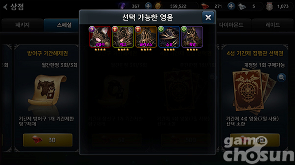 마지막으로 상점 탭에서 스페셜 카테고리를 살펴보면 4성 기간제 영웅 선택권을 구매할 수 있다. 이 기간제 영웅은 기간 해제권이나 다이아몬드를 통해 기간을 해제하는 것이 가능하다. 기간 해제권은 1주 차 1일 날 출석 보상으로 획득할 수 있다. 또한, 기간 해제권으로 4성의 집행관을 기간 해제하는 것도 가능하므로 일반 4성 기간제 영웅 선택권에 앞서 4성 집행관 선택권을 꼭 먼저 구매하도록 하자.