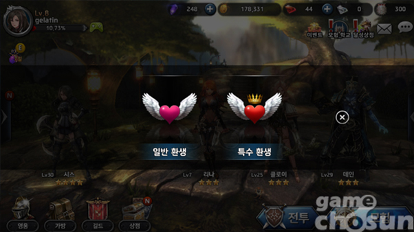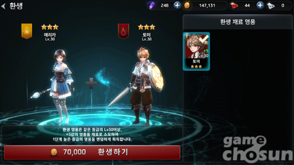 우선 일반환생의 경우 모험이나 랜덤 레벨을 통해 제물이 될 것 같은 등급의 2명의 영웅을 30 레벨까지 성장시키고 두 재물 영웅들은 강화를 통해 +5 강화까지 만들어야 한다. 예를 들자면 3성 30 레벨 +5 강화 토미와 3성 30 레벨 +5 강화 에리카를 재료로 소모하게 되면 1단계 높은 등급의 영웅을 무작위로 획득할 수 있다.