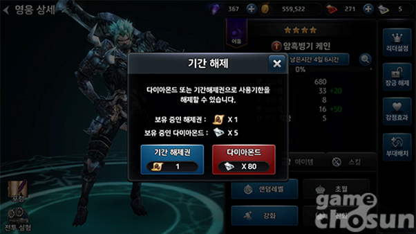 ▲ 기간 해제권으로 선택한 기간제 영웅의 사용기한을 없엘 수가 있다.