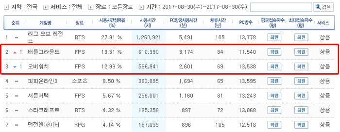 오버워치가 배틀그라운드에게 2위를 빼앗긴 것은 처음있는 일이다. 주목할 점은 배틀그라운드는 아직 '얼리엑세스' 단계를 벗어나지 못한 게임으로, 상대적으로 운영 PC방 수가 적은 편임에도 장르의 유사성이 있는 오버워치와 점유율을 나누고 있다는 것이다. 상황에 따라 타장르의 게임들이 순위권에서 반사이익을 얻을 것으로 예측되고 있다.