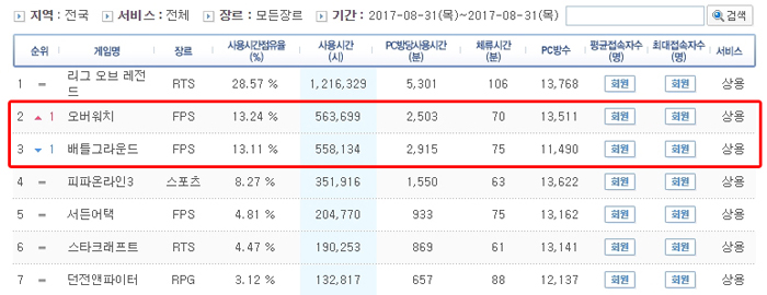 PC방 게임 순위 통계 업체 '게임트릭스'에 따르면 8월 30일에 배틀그라운드에게 PC방 순위 2위 자리를 뺏겼던 오버워치가 31일 또 다시 2위에 오르며 재역전에 성공했다. 기존 순위권의 강자 오버워치는 30일과 31일 PC방 점유율 13%를 기점으로 배틀그라운드와 치열한 레이스를 벌였다.