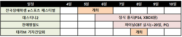 9월 1주 게임업계에는 신작 '데스티니2'의 정식 출시와 '천애명월도'의 CBT(비공개시범테스트)가 진행된다. 또 넷마블의 장애학생 e페스티벌과 신작 모바일 MMORPG(다중접속역할수행게임) '테라M'의 미디어 쇼케이스가 개최될 전망이다.