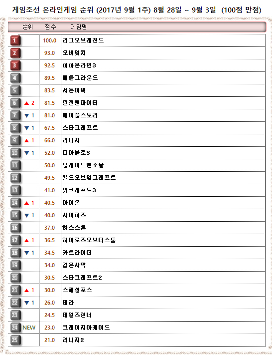 9월 1주 온라인게임순위에선 최상위권이 순위 변동 없는 안정화된 모습을 보인 가운데 ‘던전앤파이터’가 2계단 상승으로 변화의 포문을 열었다.