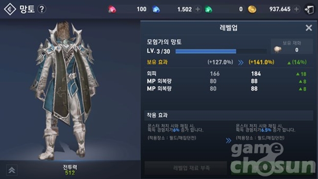 ▲ 망토의 레벨업에 사용되는 재료와 그 획득처