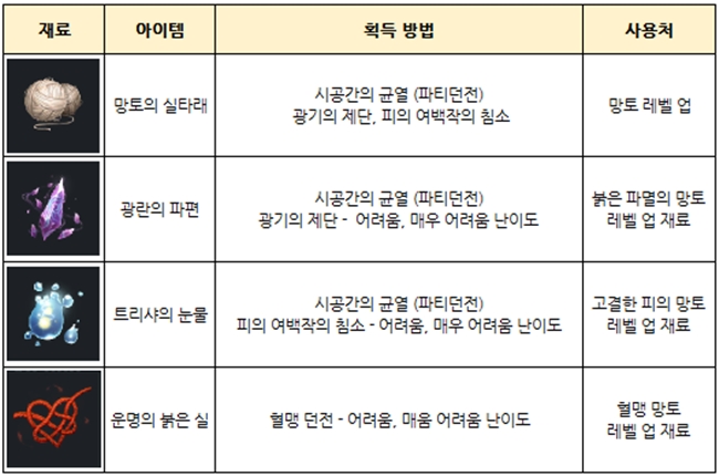 레벨업과 마찬가지로 붉은 파멸의 망토, 고결한 피의 망토는 추가 재료가 필요하며 이는 시공의 균열에서 랜덤 보상으로 획득할 수 있다.