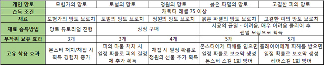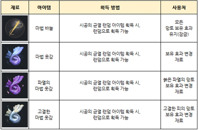 ▲ 망토의 보유 효과 변경에 사용되는 재료와 그 획득처