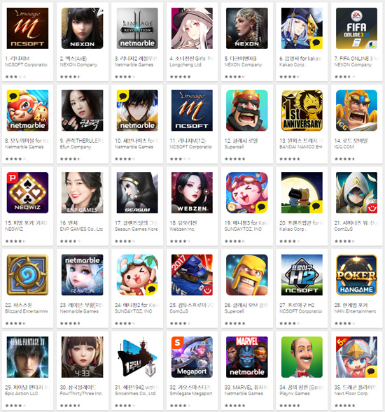 ▲ 2017년 9월 18일 오전 구글플레이 게임 부문 최고 매출 순위 갈무리
