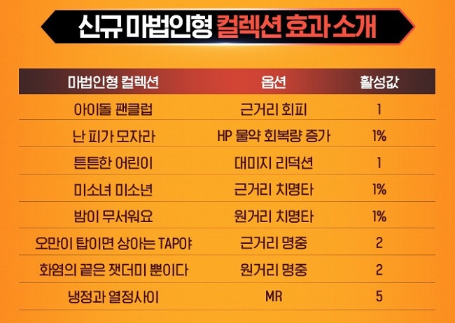 이뿐만이 아니다. 신규 마법인형 5종이 등장하는 만큼, 마법인형 컬렉션도 8종이 추가된다. 마법인형 컬렉션은 마법인형의 특정 종류를 모으고 조건을 만족하면 추가적인 능력치가 부여되는 세트 효과다.