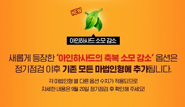 우선 신규 마법인형으로, 전설 등급은 '데몬', '얼음여왕'이 추가되며, 영웅 등급은 '아이리스', '뱀파이어', '머미로드'를 새롭게 선보인다. 데몬과 얼음여왕의 경우 경험치 보너스 20%와 무게 보너스 +2000, 아인하사드 소모 감소 18%가 공통적인 옵션이며, 데몬은 여기에 근거리 명중 +2, 스턴 내성 +10, 스턴 적중 +8%가 추가된다. 이에 반해 얼음여왕은 우 활을 주무기로 하는 요정에게 효과적인 원거리 대미지 +5와 원거리 명중 +5가 부여돼 있다.