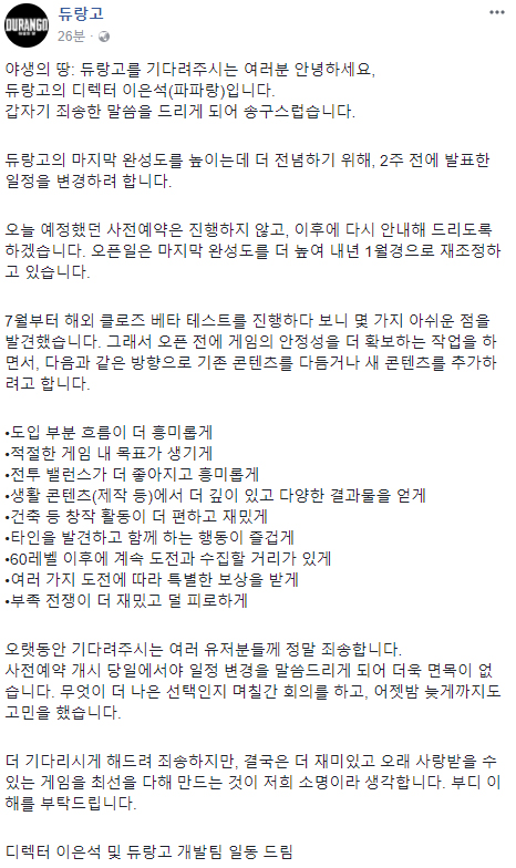 이어 그는 "사전예약 개시 당일에서야 일정 변경을 말씀드리게 돼 더욱 면목이 없다. 무엇이 더 나은 선택인지 며칠간 회의를 하고, 어젯밤 늦게까지도 고민을 했다. 더 기다리시게 해드려 죄송하지만, 결국은 더 재미있고 오래 사랑받을 수 있는 게임을 최선을 다해 만드는 것이 저희 소명이라 생각한다. 부디 이해를 부탁드린다"고 덧붙였다.