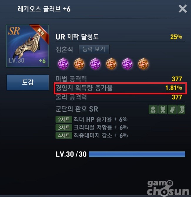 아직 레벨업 중이라면 장비 옵션으로 경험치 획득 증가 옵션을 세팅하는 것도 좋다. 단일로는 큰 도움이 되지 않지만, 워낙 옵션에 잘 뜨고 전체 부위에 골고루 띄워놓는다면 레벨업 도중에는 상당한 도움이 된다.