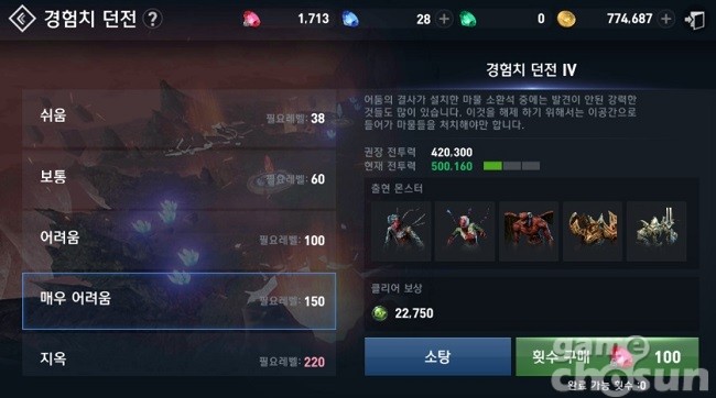 말그대로 동시간에 가장 많은 경험치를 얻을 수 있는 콘텐츠인 경험치 던전은 하루 기본 2회 진행할 수 있고, 여기에 레드다이아를 소모하여 입장 횟수를 최대 6회까지 추가로 구매할 수 있다.