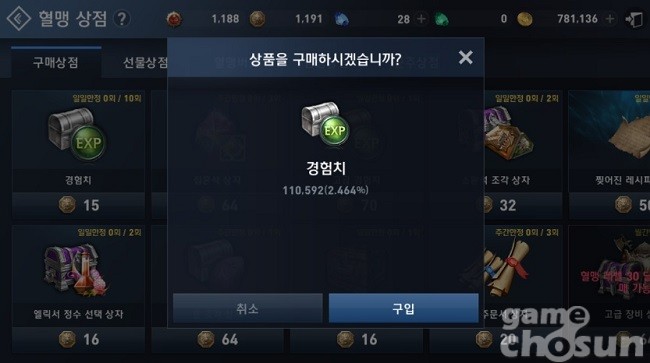 일정 레벨 이상의 혈맹 상점에서는 '혈맹 주화'로 일일 한정 경험치 상자를 구매할 수 있다. 혈맹 레벨 및 공헌도에 따라 구매 품목 및 수량이 달라지지만, 일반적으로 일반 경험치 상자는 일일 10개까지, 고급 경험치 상자는 일일 1개까지 구매할 수 있다.