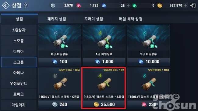 또한, 매일 혜택 상점 중 매일 퀘스트 혜택을 선택하면 매일 보상으로 S등급 스크롤을 3개씩 얻을 수 있고, 퀘스트 자동 수행 기능을 이용할 수 있어 더욱 편리하게 진행할 수 있다.