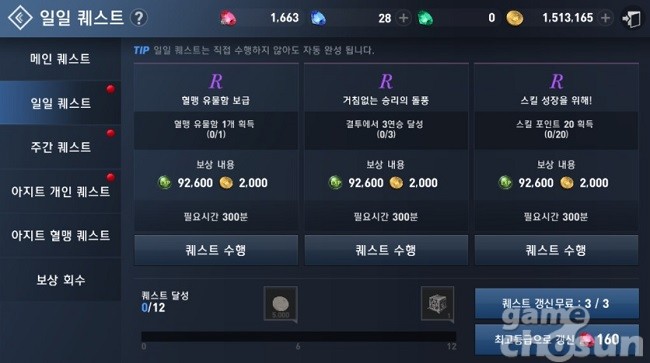 때문에 무료 갱신으로 최대한 R등급을 노려보고 과감하게 '최고등급으로 갱신(레드다이아 160 소모)' 기능을 이용해 R등급으로 완수하는 것도 많은 경험치를 확보할 수 있는 방편 중 하나다.