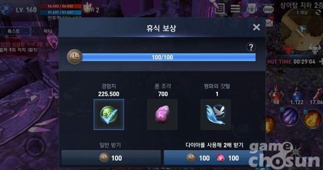 얻을 수 있는 절대량은 레벨에 따라 다르지만 어느 레벨에서나 다이아나 퀘스트로만 얻을 수 있는 'S급 스크롤' 보상보다도 높은 경험치 보상을 얻을 수 있으므로 빠른 레벨업을 노리고 있는 유저라면 휴식 보상은 2배로 받는 것을 추천한다.