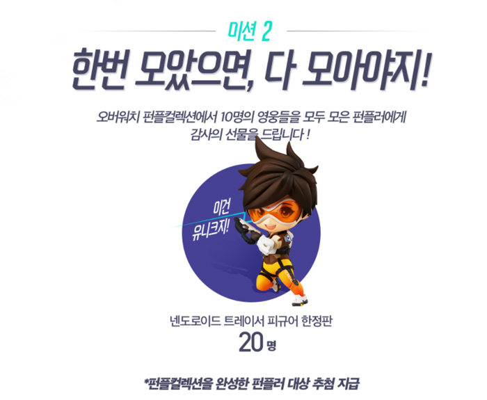 ▲ 오버워치 펀플컬렉션이서 10명의 영웅을 모두 모은 유저에게는 굿스마일에서 정식 넘버링이 붙어서 제작된 트레이서 넨도로이드가 주어진다.