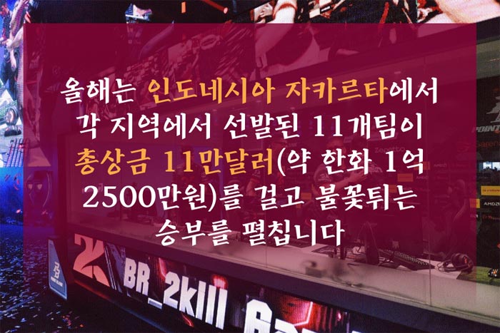 올해는 인도네시아 자카르타에서 각 지역에서 선발된 11개팀이 총상금 11만달러(약 한화 1억 2500만원)를 걸고 불꽃튀는 승부를 펼칩니다.