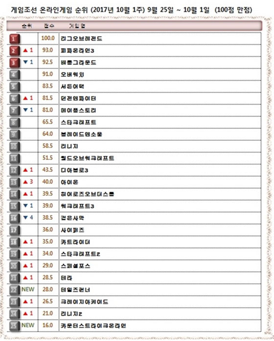 10월 첫째 주 온라인게임순위는 ‘피파온라인3’ ‘아이온’ ‘테일즈런너’의 상승세가 눈에 띈다. 지난 주 2위 자리를 내준 ‘피파온라인3’는 ‘배틀그라운드’를 근소한 차이로 제치고 2위를 탈환하는데 성공했다.