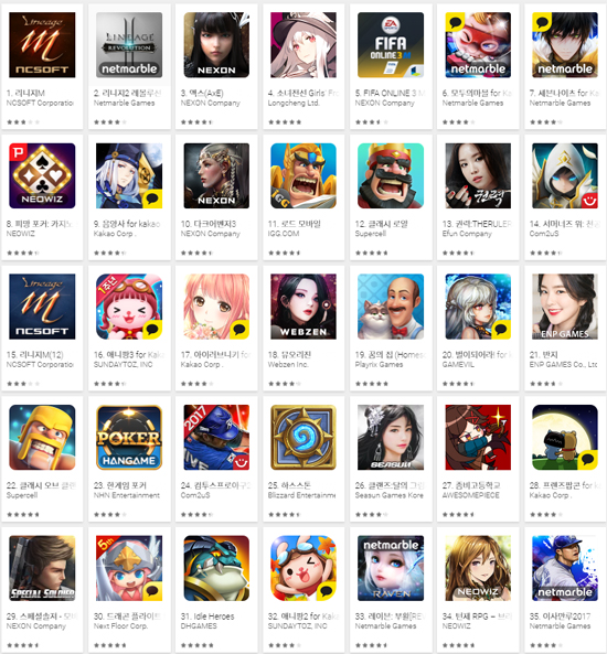 ▲ 2017년 10월 9일 오후 구글플레이 게임 부문 최고 매출 순위 갈무리