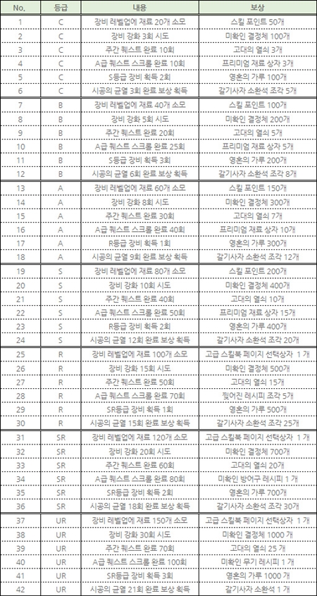 등급별 미션은 위와 같다. 미션의 종류는 항상 같으며 장비 획득 미션을 제외하면 등급이 올라감에 따라 요구 횟수만 늘어나는 방식이다.
