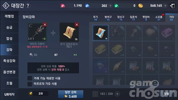 장비 강화도 마찬가지로 주장비에 축복받은 강화주문서, 마프르의 가호를 소모하는 것보다는 안쓰는 장비 혹은 강화가 되지 않은 서브 캐릭터의 장비에 일반 강화주문서를 투자하는 쪽이 시행 횟수를 늘려 미션 달성을 쉽게 해준다.