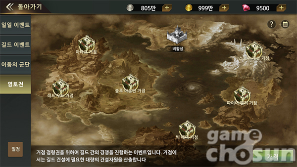 하지만 아무리 강한 길드라도 6가지 거점 중에 단 한 곳에만 입찰 신청을 할 수 있다. 이런 요소들을 통해 한 길드가 여러 곳의 거점을 점령하는 독과점을 방지하고, 서버 내 1위길드가 아니더라도 거점 점령전에 참여해볼만한 도전 욕구를 자극시킨다.