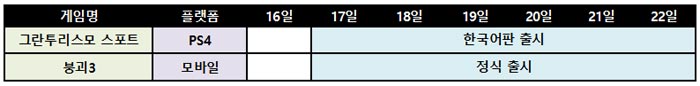 10월 3주 게임업계에는 2종의 게임이 출시를 앞두고 있다. 먼저 그란투리스모스포트의 한국어판이 발매될 예정이다. 또 중국에서 큰 인기를 끌었던 모바일게임 '붕괴3'이 공개된다.