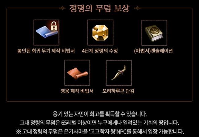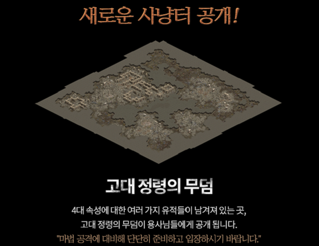 우선 고대 정령의 무덤은 강력한 마법 공격을 가하는 몬스터가 등장하는 곳으로, 입장 레벨 제한은 65레벨이다. 이곳에서는 '봉인된 희귀 무기 제작 비법서'와 상대의 이로운 효과를 해제하는 마법 '캔슬레이션', '영웅 제작 비법서', '오리하루콘 단검', '4단계 정령의 수정'을 획득 가능하다. 해당 사냥터에 입장하기 위해서는 은기사 마을의 NPC '고고학자 웡'과 대화하면 된다.