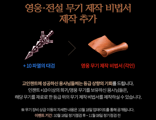 이와 더불어 고강화에 성공한 플레이어에게는 특별한 혜택이 주어지는 이벤트가 진행될 예정이다. 희귀 또는 영웅 등급 무기의 +10 강화 이상에 성공할 경우, 해당 무기를 재료로 한 등급 높은 무기 제작 비법서를 얻을 수 있게 된다. 이벤트는 10월 18일(수)부터 11월 8일(수)까지 진행된다.