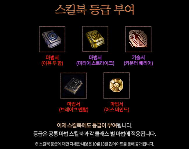 이번 업데이트에서는 플레이어가 스킬북의 중요도를 명확하게 판단할 수 있도록 장비와 동일하게 스킬북에 등급도 부여된다.