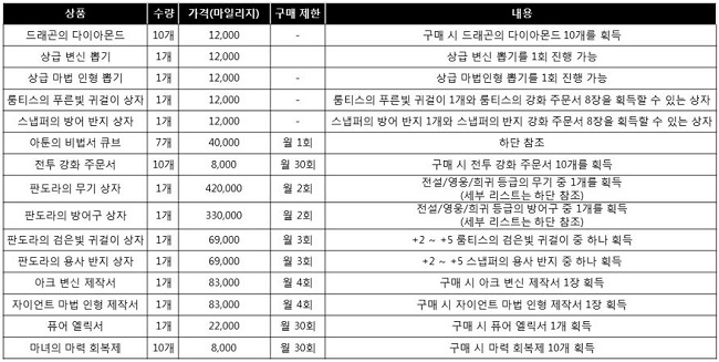 마지막으로 공지사항에서는 마일리지 상점의 개편에 대해 소개했다. 마일리지는 리니지M의 유료 재화인 다이아로 상품을 구매할 시 획득할 수 있는 포인트로, 이를 모아서 마일리지 전용 상품 구매가 가능하다. 마일리지 상점의 개편 상품은 아래와 같다.