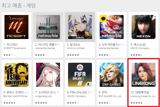 라인콩코리아가 서비스하고 넷이즈가 개발한 모바일 항해 MMORPG(다중접속역할수행게임) '대항해의길'이 구글플레이 게임부문 최고매출 순위 10위에 올랐다.