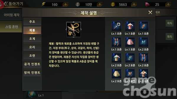 '주조'와 '재봉'은 활력과 재료를 소모하여 지정된 레벨 구간의 장비를 생산하는 콘텐츠이다. 해당 생활스킬의 레벨이 올라갈수록 생산하는 장비의 레벨 구간이 높아지고 생산에 소모되는 활력과 재료는 점점 늘어간다.